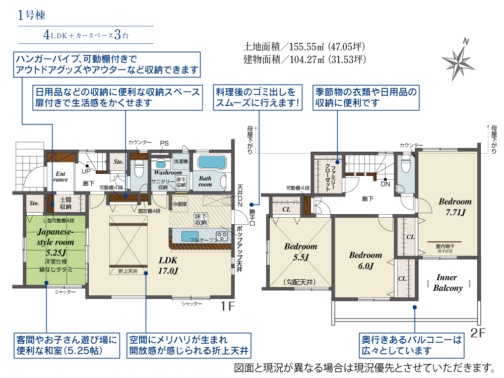 土地面積 155.55m² ・建物面積 104.27m² ・駐車場3台