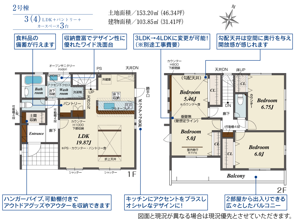 土地面積 152.14m² ・建物面積 101.54m² ・駐車場2台