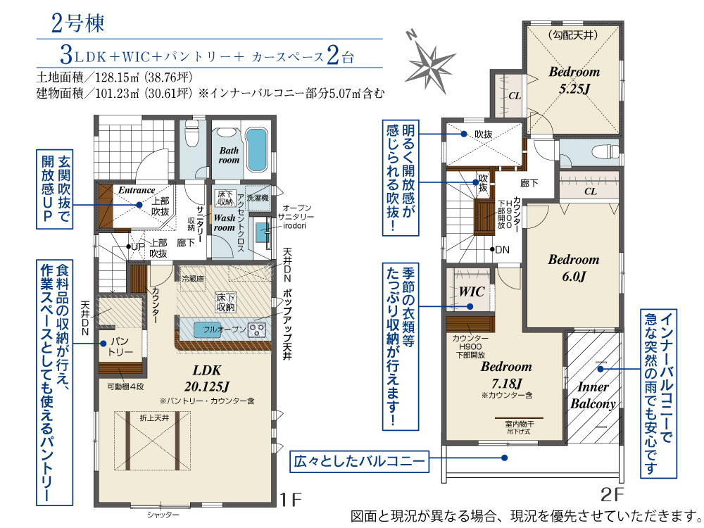 土地面積 128.15m² ・建物面積 101.23m² ・駐車場2台