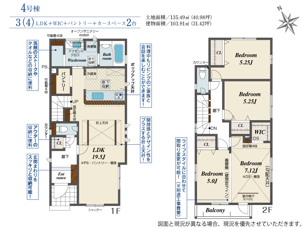 土地面積 135.49m² ・建物面積 103.91m² ・駐車場2台