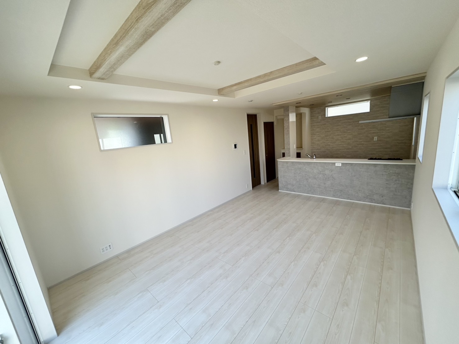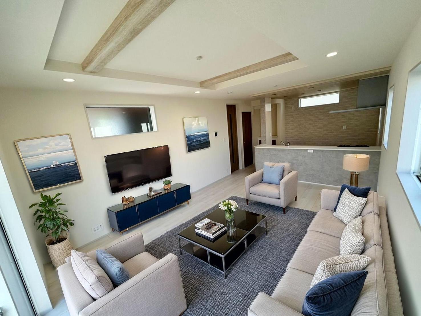 • 【2号棟】リビング 奥行きを演出する折り上げ天井。シーリングファンとの相性も良好です