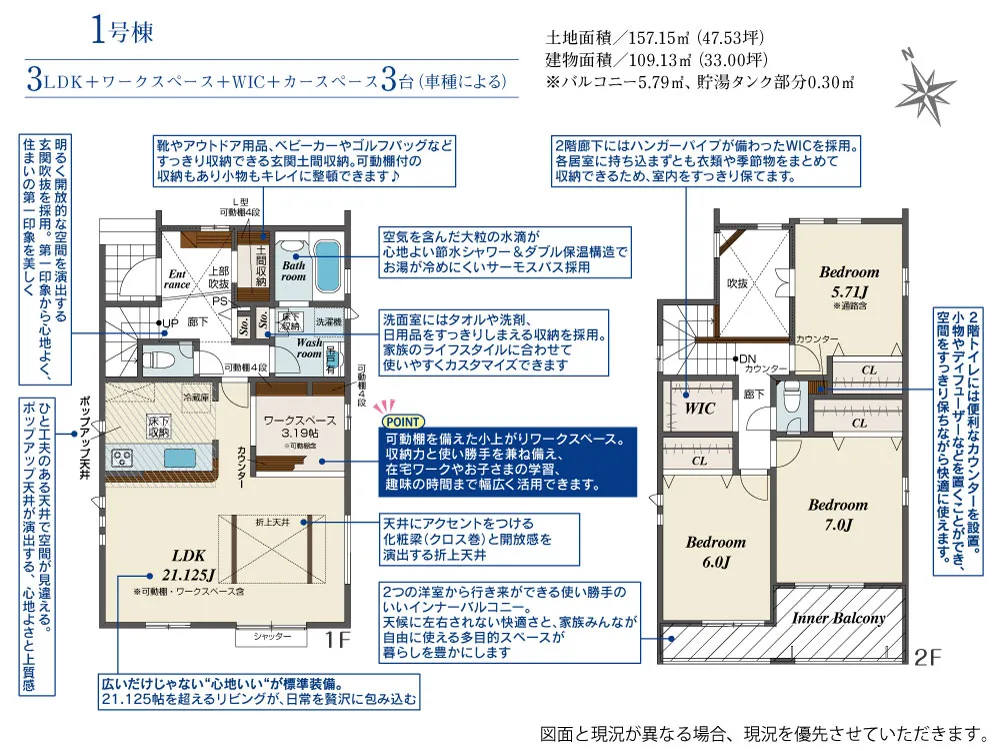 - 建物面積にインナーバルコニー部分5.79m2、貯湯タンク部分0.30m2含む