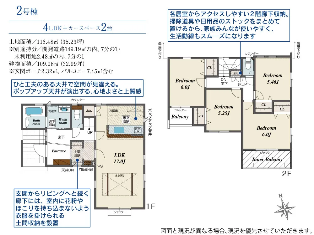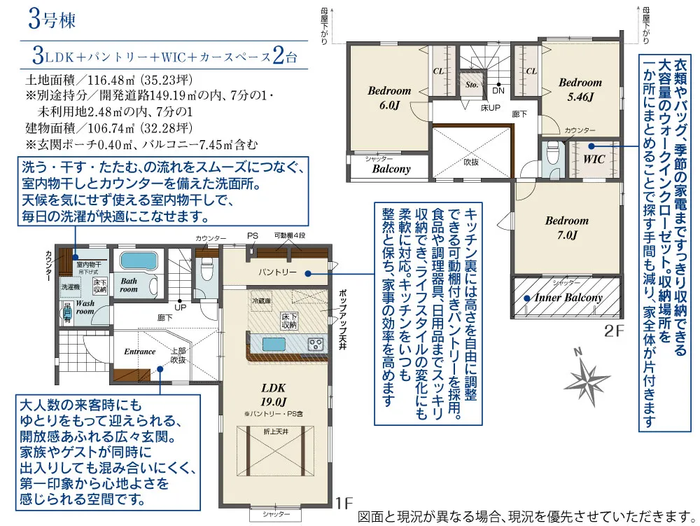 - 建物面積に玄関ポーチ2.32m2、バルコニー7.45m2含む