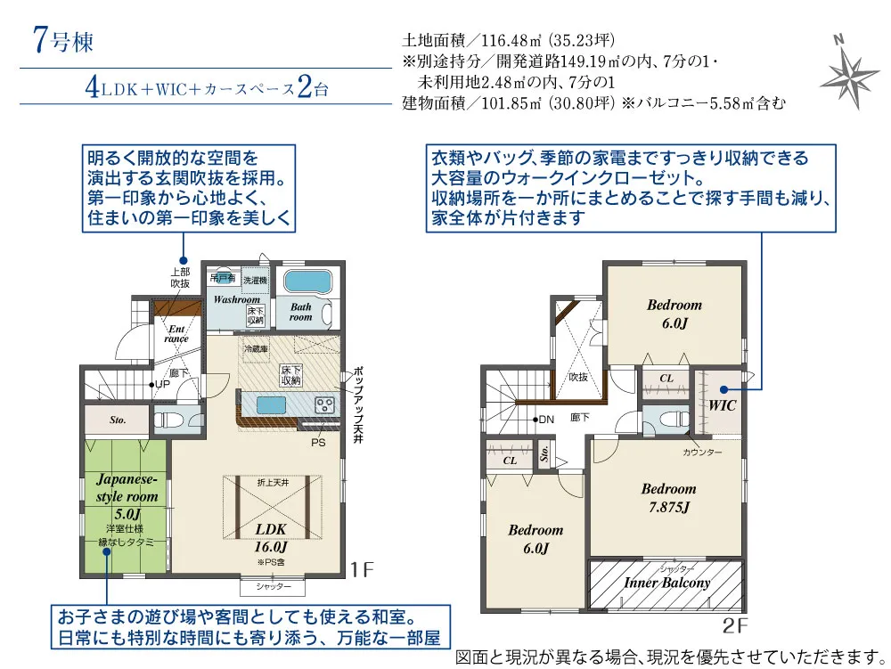 - 建物面積に玄関ポーチ0.40m2、バルコニー7.45m2含む