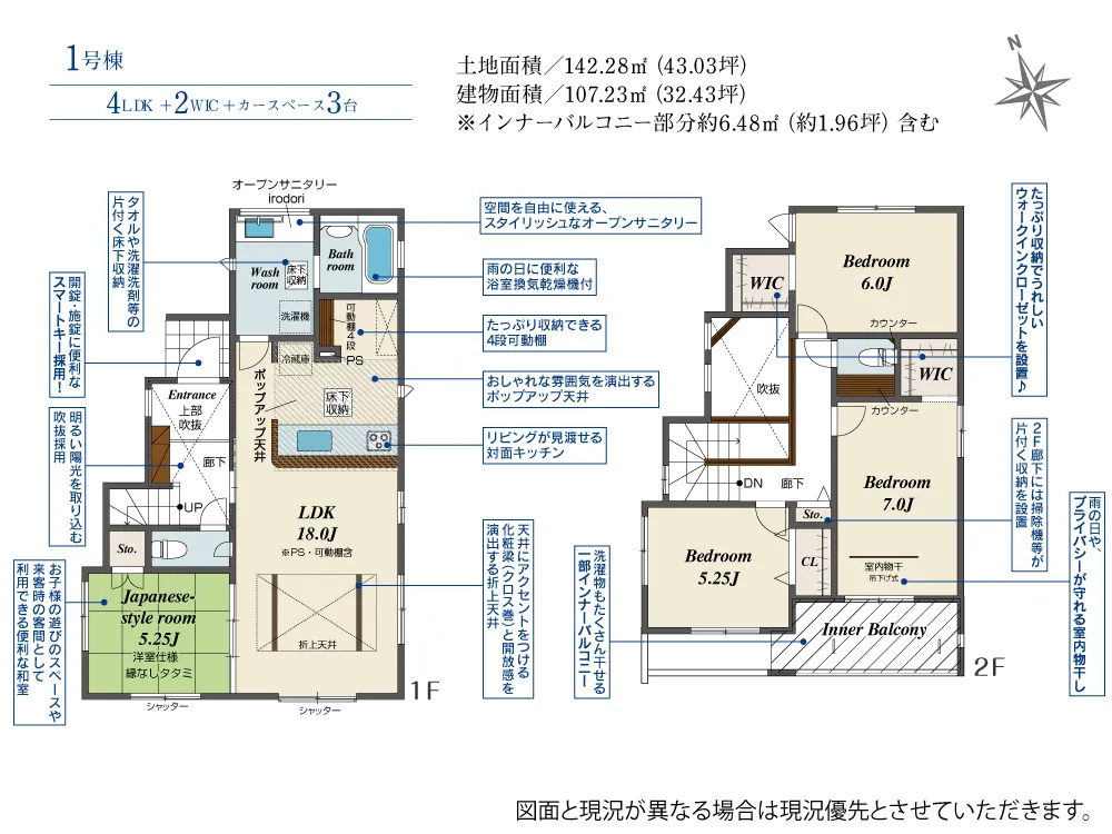 - 建物面積にインナーバルコニー部分約6.48m2(約1.96坪)含む