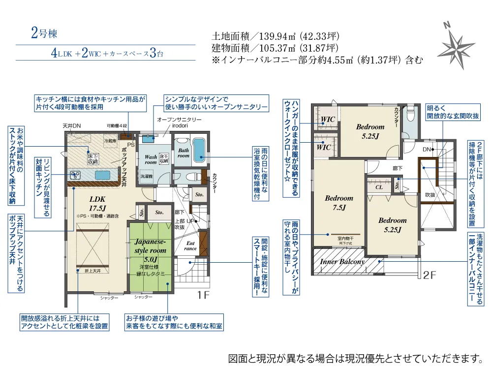 - 建物面積にインナーバルコニー部分約4.55m2(約1.37坪)含む