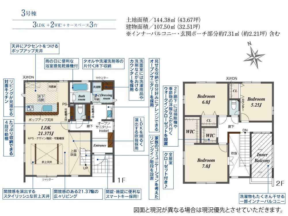 - 建物面積にインナーバルコニー・玄関ポーチ部分約7.31m2(約2.21坪)含む