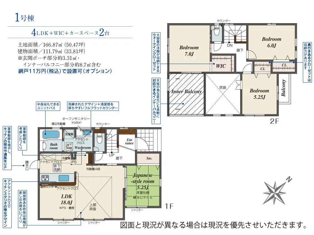 - 建物面積に玄関ポーチ部分約3.31m2、インナーバルコニー部分約8.7m2含む