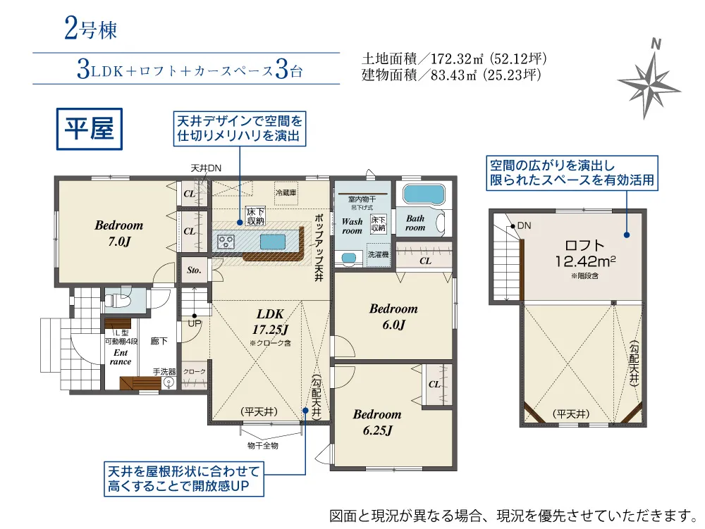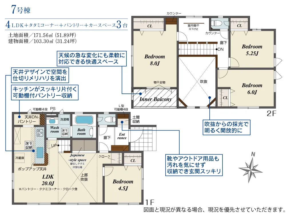 - 建物面積にインナーバルコニー部分7.25m2含む。