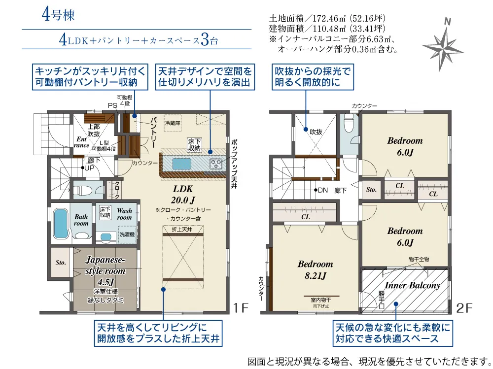 - 建物面積にインナーバルコニー部分6.63m2、オーバーハング部分0.36m2含む。