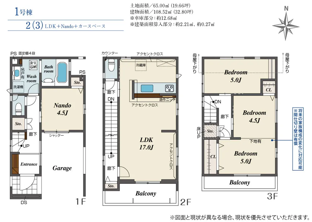 | 土地面積 | 65.00m² | 建物面積 | 108.52㎡ |