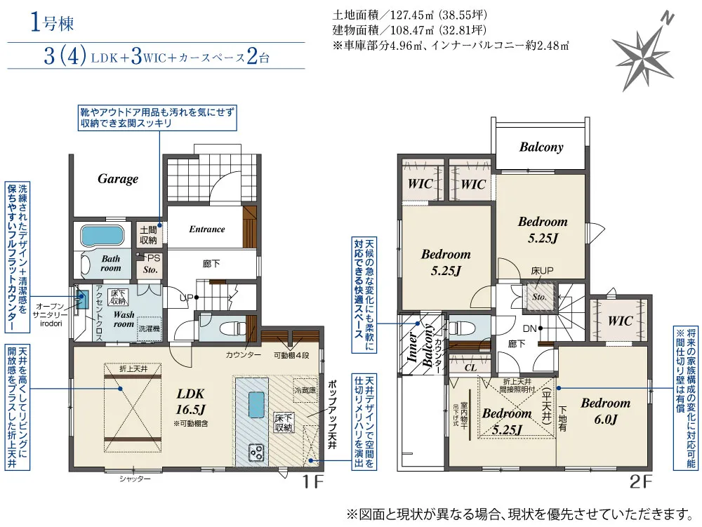 - 建物面積に車庫部分4.96m2、インナーバルコニー約2.48m2含む