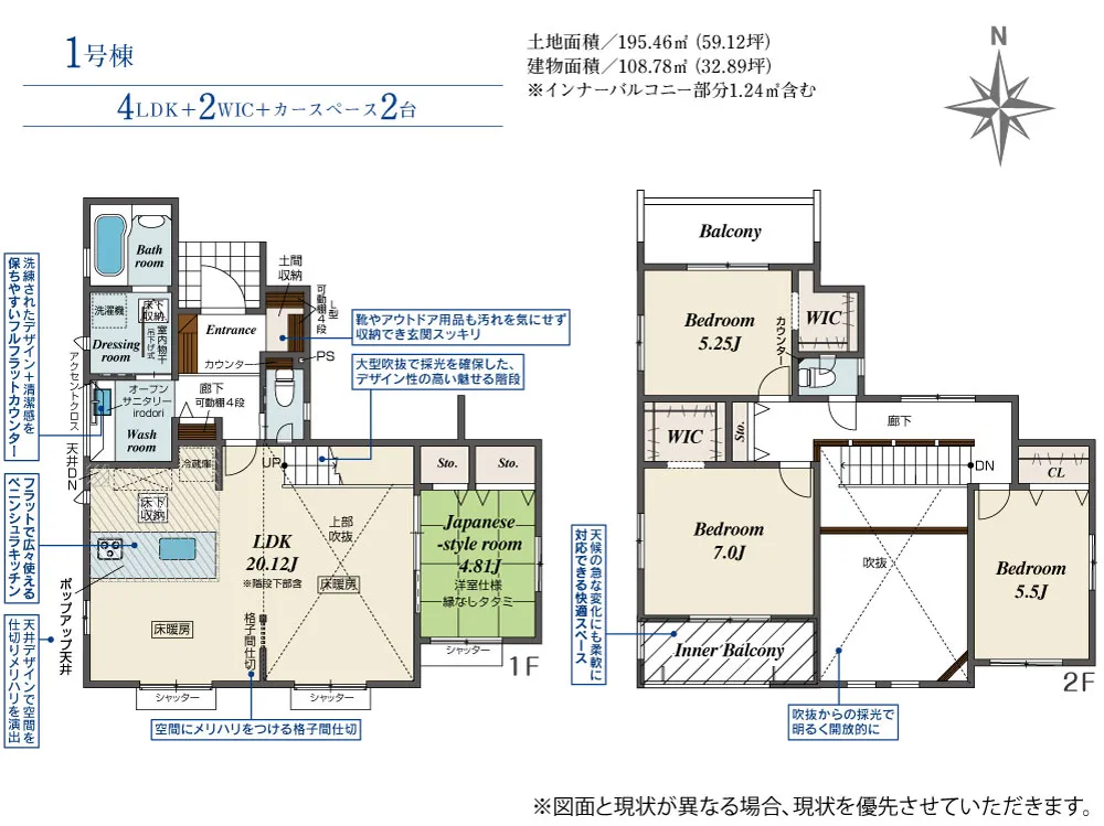- 建物面積にインナーバルコニー部分1.24m2含む
