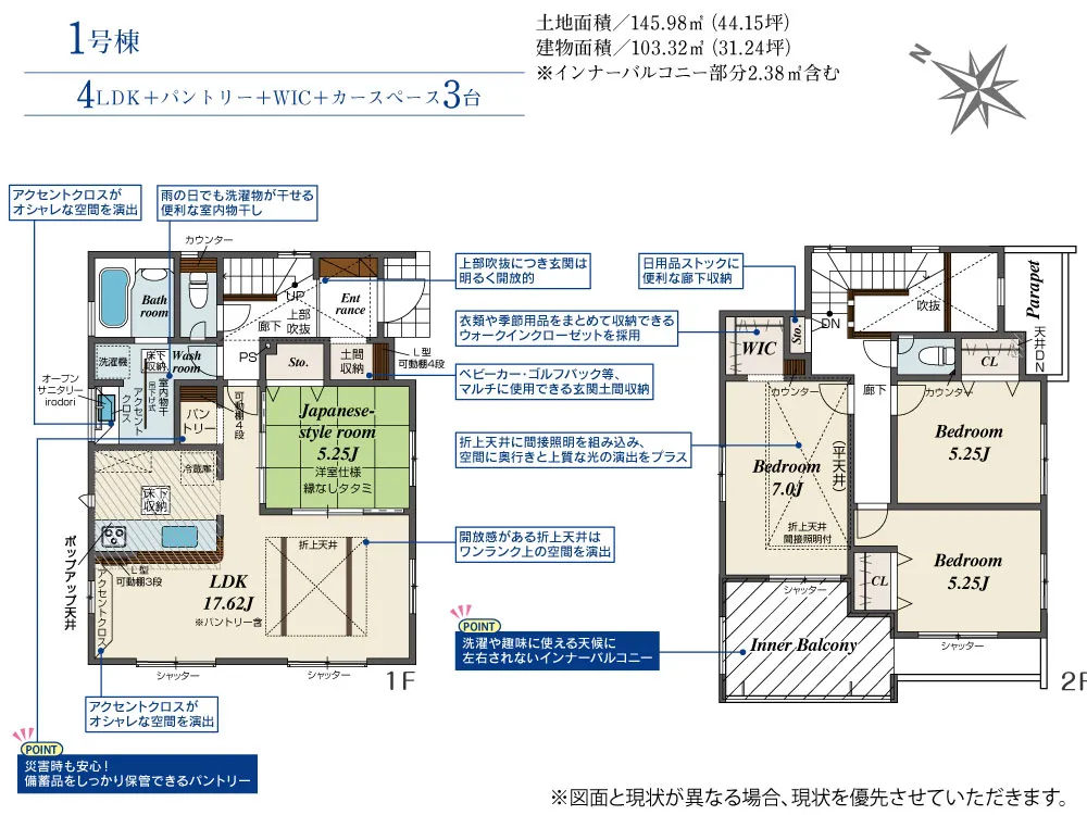 - 建物面積にインナーバルコニー部分2.38m2含む