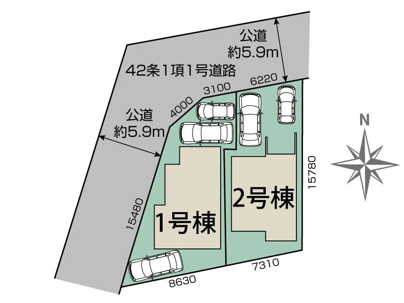 | 接道 | 北5.9m公道42条1項1号道路、西5.9m公道42条1項1号道路 | ||