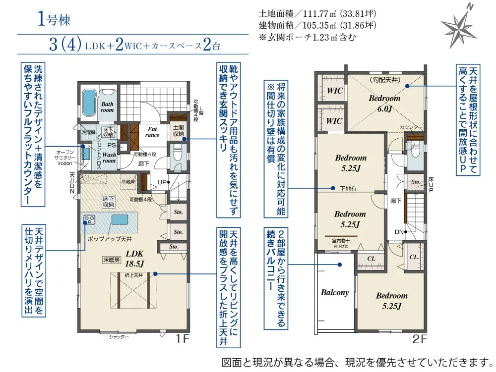 | 土地面積 | 111.14~111.77m² | 建物面積 | 105.35~105.52㎡ |