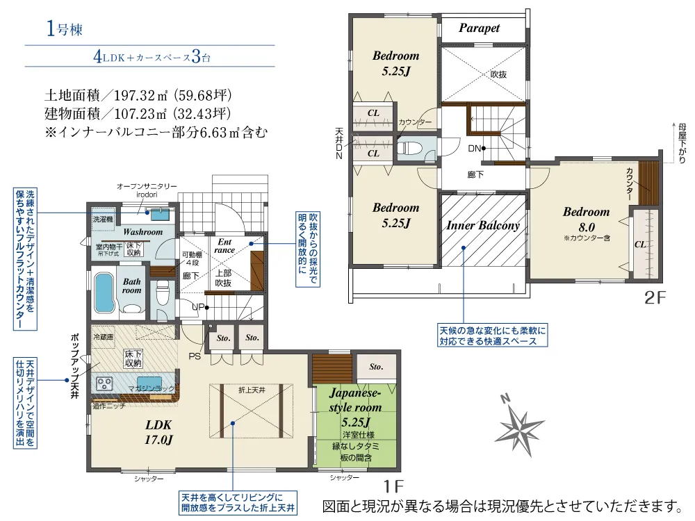 - 建物面積にインナーバルコニー部分6.63m2含む