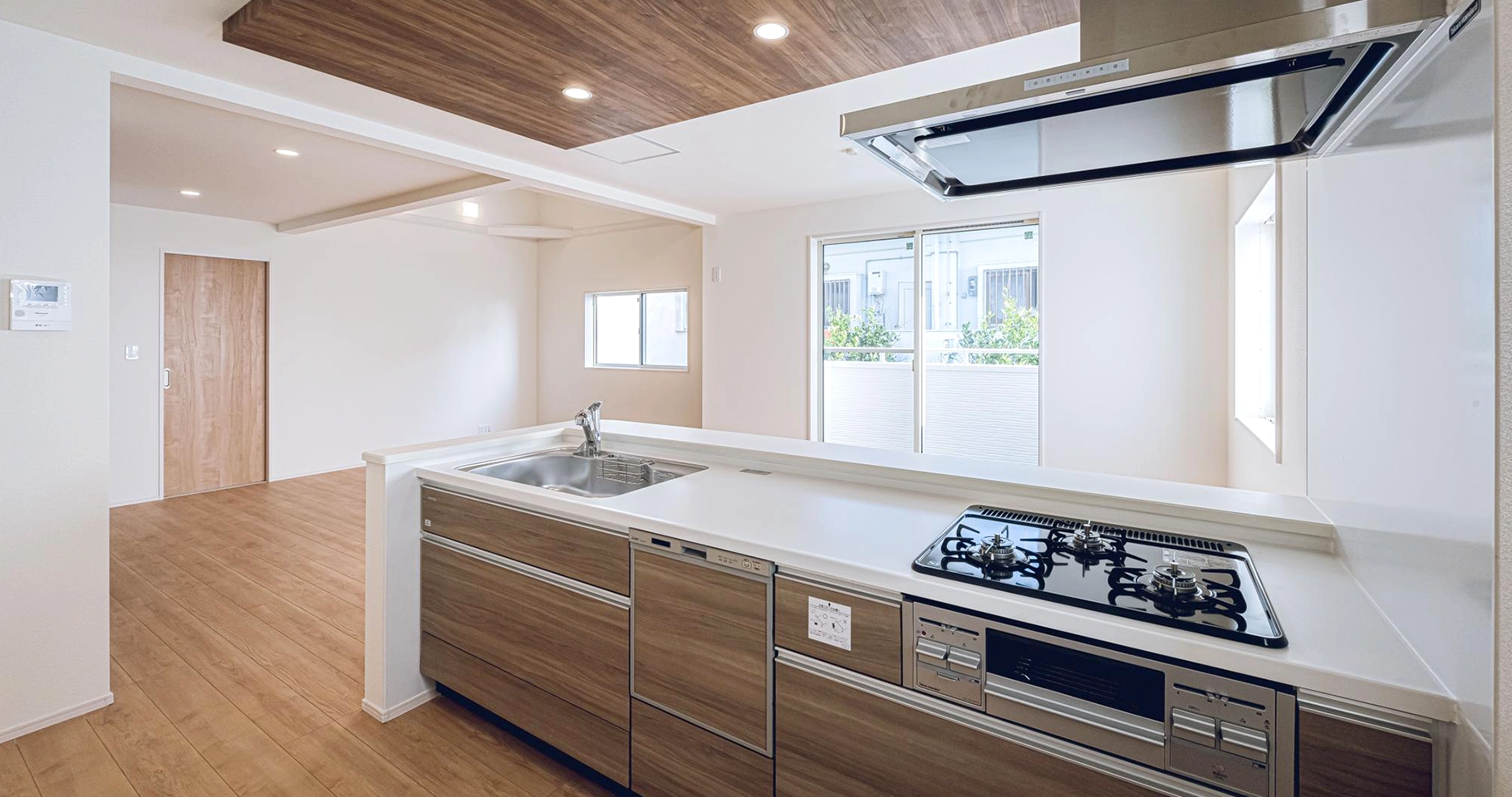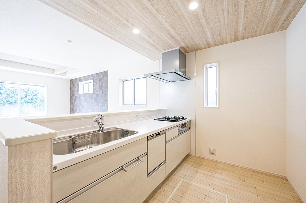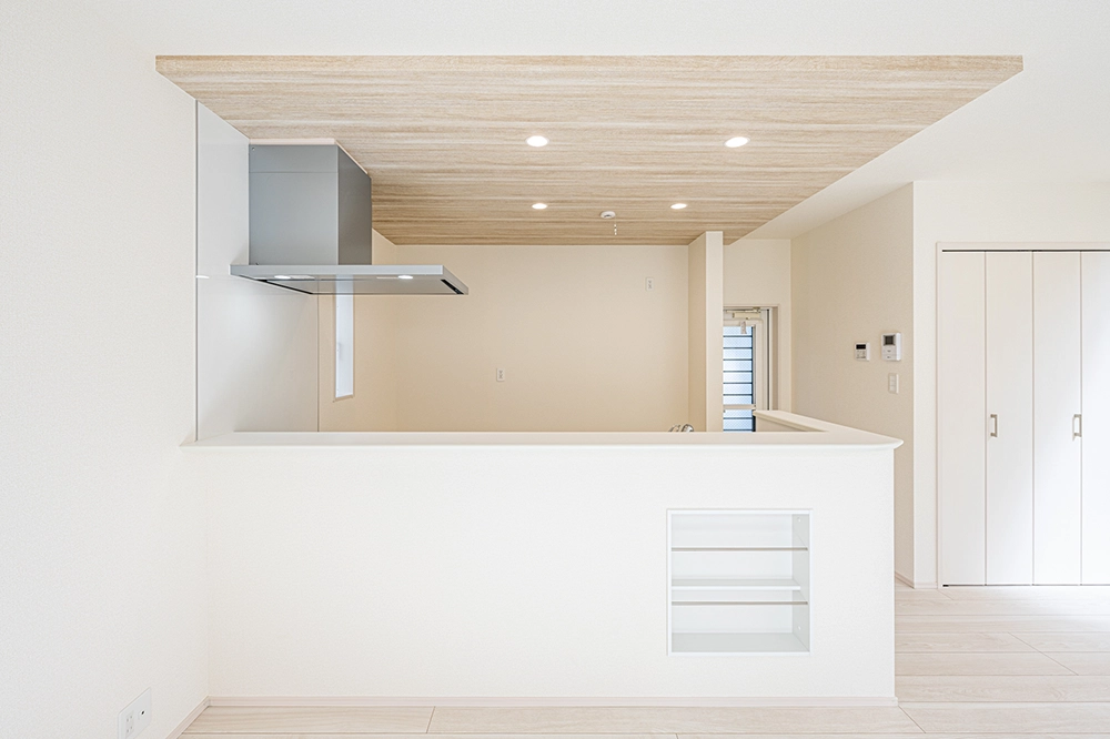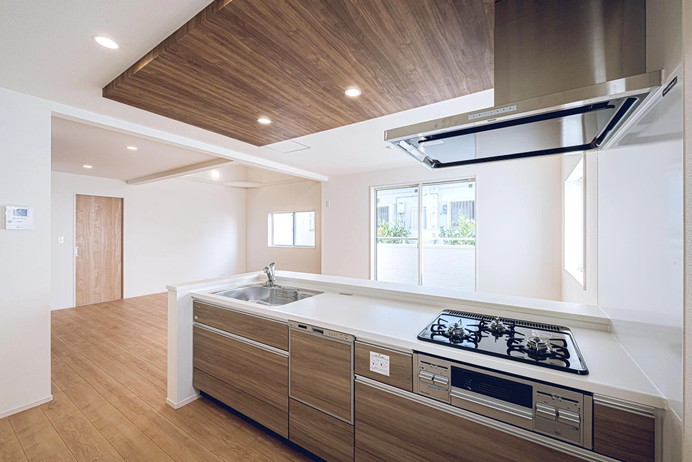 アクセントクロスを配したポップアップ天井をより際立たせ、さらに開放的な空間を演出します。コンロの前でもリビング空間を見渡すことができるので、テレビを見ながら、会話をしながらの作業が可能となります!